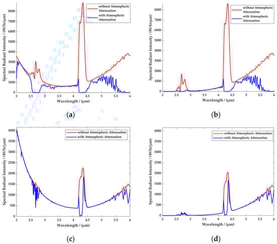 A big commercial aircraft was used as the analysis target and its infrared signature during take-off and cruising phases was simulated. The skin material of the aircraft was white paint, the emissivity was 0.8 and the reflectivity was 0.2. When the thrust was reduced by 25% during the take-off phase, the initial skin temperature was 288 K and EGT was 1000 K. During the cruising phase, the skin equilibrium temperature was 255 K, and the cruising altitude was 10 Km [37,38,39]. The results of the spectral radiant intensity in the two phases are shown in Figure 3.