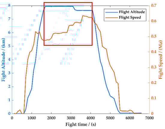 The flight route used for analysis in this paper was obtained from the measured Flight Operations Quality Assurance (FOQA) data. The FOQA flight data come from the real parameters of various instruments and equipment of the aircraft. When an aircraft is in flight, the FDIMU data collector on the aircraft collects thousands of high-quality original parameters on the aircraft bus per second according to the ARINC 429 protocol. The data are acquired in real time on-board the aircraft and downloaded by the airline once the aircraft reaches the destination gate [40,41]. The altitude and speed changes of the flight route are shown in Figure 4. The total flight time was about 1 h and 22 min, and its cruising time was about 2400 s. The detection optimization method in this paper focuses on the cruising phase, as shown in the red box in Figure 4.