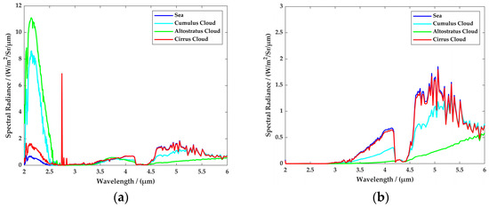 The spectral properties of different cloud marine backgrounds were simulated. In this study, MODTRAN 5 was used to simulate the atmospheric radiative transfer process and obtain the background radiance. The background types were sea, cumulus cloud, altostratus cloud and cirrus cloud in the equatorial region [42,43,44], and the calculation conditions were divided into daytime and nighttime. The simulation results are shown in Figure 6. It can be seen that the cloud background was strongly affected by sunlight during the daytime, which was the main factor affecting the detection.