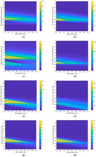 The spectral band optimization results of with different backgrounds. (a) Daytime cumulus cloud; (b) daytime altostratus cloud; (c) daytime cirrus cloud; (d) daytime sea; (e) nighttime cumulus cloud; (f) nighttime altostratus cloud; (g) nighttime cirrus cloud; (h) nighttime sea.