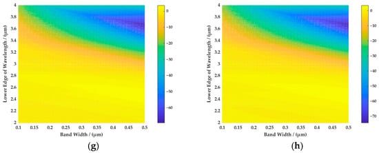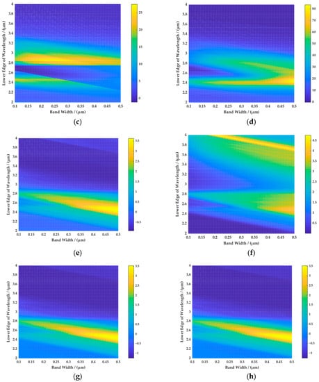 The spectral band optimization results of are shown in Figure 7. The extreme value was obtained near the 2.6–2.8 μm absorption band, and they were all higher than 100, except the daytime cirrus cloud background. The value in (c) was the lowest; therefore, it was the most difficult to detect the target, and obtained a peak value at 2.8 μm, which was above 60. According to the threshold discussed in the previous section, it can be seen that most of the spectral bands selected based on the target and background contrast met greater than 10, and the specific spectral band should be further determined by combining camera to achieve .
