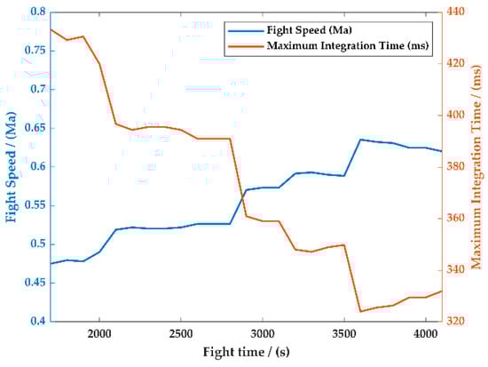 For the cruising phase of the flight route in the previous section, its dynamic speed curve is shown in Figure 10. During the cruising period from 1700 s to 4100 s, the flight speed monotonously increased from 0.47 Ma to 0.62 Ma. Based on a of 70 m and the limit of air target flying no more than one pixel, the maximum integration time was 433 ms to 331 ms, which matched the velocity curve, as shown on the right axis in the figure.