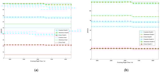 Performance improvement for cumulus cloud, altostratus cloud and cirrus cloud backgrounds (daytime). (a) The straight line represents of the fixed-parameter system, and the straight line with circles represents after the proposed on-board spectral band optimization algorithm; (b) the straight line with dots represents after the proposed on-board spectral band optimization algorithm, the straight line with diamonds represents after the proposed on-board spectral band optimization and on-board parameter optimization algorithm.
