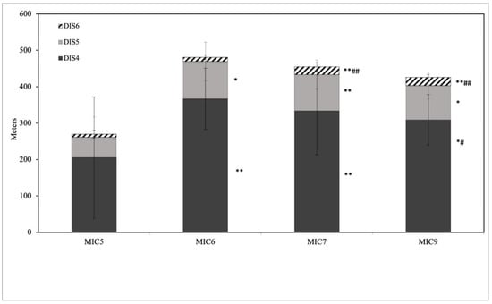 DIST was 3691.78 ± 340.73, 4027.17 ± 367.58, 4192.63 ± 320.21 and 4332.27 ± 320.00 for MIC5, MIC6, MIC7 and MIC9, respectively. There was a significant difference (F(3,36) = 14.435, p < 0.001, η2 = 0.546) between MIC5 and MIC6 (p < 0.001), MIC7 (p < 0.001) and MIC9 (p < 0.001) and between MIC6 and MIC9 (p = 0.03). DIS4 was 205.37 ± 166.66, 366.79 ± 84.01, 334.04 ± 120.82 and 309.09 ± 69.33 for MIC5, MIC6, MIC7 and MIC9, respectively. There was a significant difference (F(3,36) = 11.206, p < 0.001, η2 = 0.483) between MIC5 and MIC6 (p = 0.001), MIC7 (p < 0.001) and MIC9 (p = 0.023) and between MIC6 and MIC9 (p = 0.002). DIS5 was 55.96 ± 55.79, 102.77 ± 52.92, 99.30 ± 39.45 and 93.75 ± 36.92 for MIC5, MIC6, MIC7 and MIC9, respectively. There was a significant difference (F(3,36) = 5.883, p = 0.002, η2 = 0.329) between MIC5 and MIC6 (p = 0.013), MIC7 (p = 0.003) and MIC9 (p = 0.028). DIS6 was 8.24 ± 10.49, 11.10 ± 6.40, 21.44 ± 11.31 and 22.92 ± 8.12 for MIC5, MIC6, MIC7 and MIC9, respectively. There was a significant difference (F(3,36) = 22.305, p < 0.001, η2 = 0.650) between MIC5 and MIC7 (p < 0.001) and MIC9 (p < 0.001) and between MIC6 and MIC7 (p = 0.002) and MIC9 (p < 0.001). The results are presented in Figure 2.