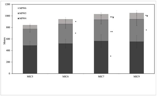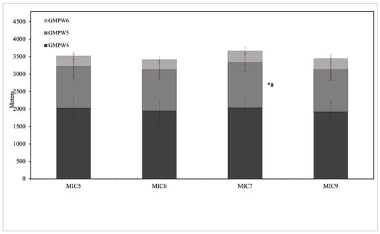 GMPW4 was 2025.59 ± 304.48, 1948.76 ± 310.94, 2035.74 ± 277.08 and 1919.13 ± 310.53 for MIC5, MIC6, MIC7 and MIC9, respectively. There was no significant difference (F(3,36) = 0.799, p = 0.503, η2 = 0.062). GMPW5 was 1201.26 ± 340.02, 1178.44 ± 260.60, 1306.87 ± 270.50 and 1220.52 ± 312.99 for MIC5, MIC6, MIC7 and MIC9, respectively. There was a significant difference (F(3,36) = 3.095, p = 0.039, η2 = 0.205) between MIC5 and MIC7 (p = 0.035) and between MIC6 and MIC7 (p = 0.001). GMPW6 was 296.27 ± 108.33, 288.82 ± 93.52, 324.09 ± 99.44 and 312.40 ± 109.48 for MIC5, MIC6, MIC7 and MIC9, respectively. There was no significant difference (F(3,36) = 1.779, p = 0.169, η2 = 0.129). The results are presented in Figure 7.