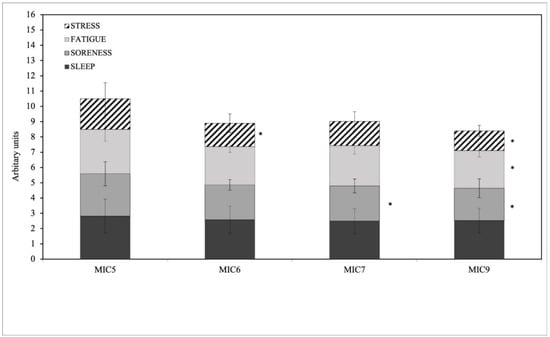 Wellness score average values. SLEEP = sleep responses, SORENESS = muscle soreness responses, FATIGUE = fatigue responses, STRESS = stress responses; MIC5 = five-day microcycle, MIC6 = six-day microcycle, MIC7 = seven-day microcycle, MIC9 = nine-day microcycle; * difference from MIC5, p < 0.05. Error bars are 95% confidence limits.