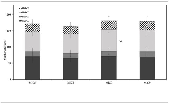 GACC2 was 70.68 ± 17.08, 65.45 ± 10.03, 71.11 ± 9.93 and 69.59 ± 13.01 for MIC5, MIC6, MIC7 and MIC9, respectively. There was no significant difference (F(3,36) = 1.560, p = 0.216, η2 = 0.115). GACC3 was 15.81 ± 11.05, 14.67 ± 9.13, 16.01 ± 9.58 and 17.10 ± 10.71 for MIC5, MIC6, MIC7 and MIC9, respectively. There was no significant difference (F(3,36) = 1.582, p = 0.211, η2 = 0.116). GDEC2 was 60.69 ± 11.22, 60.34 ± 10.26, 67.68 ± 10.30 and 66.26 ± 16.15 for MIC5, MIC6, MIC7 and MIC9, respectively. There was a significant difference (F(3,36) = 2.917, p = 0.047, η2 = 0.196) between MIC5 and MIC7 (p = 0.035) and between MIC6 and MIC7 (p = 0.002). GDEC3 was 24.51 ± 13.37, 23.64 ± 12.69, 26.40 ± 12.72 and 26.37 ± 14.04 for MIC5, MIC6, MIC7 and MIC9, respectively. The values for MIC7 and MIC9 were higher but without a significant difference (F(3,36) = 1.884, p = 0.150, η2 = 0.136). The results are presented in Figure 5.