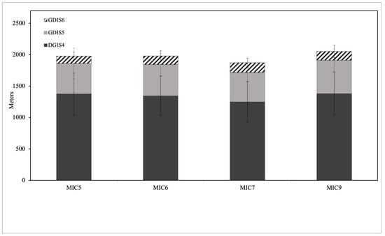 GDIS4 was 1375.27 ± 336.47, 1345.81 ± 314.09, 1247.22 ± 328.97 and 1379.36 ± 340.17 for MIC5, MIC6, MIC7 and MIC9, respectively. There was no significant difference (F(3,36) = 0.776, p = 0.515, η2 = 0.061). GDIS5 was 485.28 ± 244.88, 496.04 ± 177.73, 472.37 ± 155.74 and 532.35 ± 179.27 for MIC5, MIC6, MIC7 and MIC9, respectively. There was no significant difference (F(3,36) = 0.821, p = 0.491, η2 = 0.064). GDIS6 was 117.50 ± 63.75, 137.58 ± 82.72, 151.40 ± 71.38 and 141.08 ± 99.75 for MIC5, MIC6, MIC7 and MIC9, respectively. There was no significant difference (F(3,36) = 1.020, p = 0.393, η2 = 0.078). The results are presented in Figure 6.