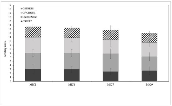 GSLEEP was 3.05 ± 1.22, 2.96 ± 0.73, 2.39 ± 0.83 and 2.64 ± 0.95 for MIC5, MIC6, MIC7 and MIC9, respectively. This parameter had lower values for MIC7 and MIC9 but without a significant difference (F(3,51) = 2.360, p = 0.082, η2 = 0.122). GSORENESS was 3.99 ± 0.86, 4.07 ± 0.94, 4.48 ± 1.23 and 3.47 ± 1.01 for MIC5, MIC6, MIC7 and MIC9, respectively. This parameter had lower values for MIC6 and MIC7 but without a significant difference (F(3,51) = 2.161, p = 0.104, η2 = 0.113). GFATIGUE was 3.94 ± 0.7, 3.86 ± 0.95, 3.54 ± 1.7 and 3.59 ± 1.14 for MIC5, MIC6, MIC7 and MIC9, respectively. This parameter had lower values for MIC7 but without a significant difference (F(3,49) = 0.641, p = 0.592, η2 = 0.036). GSTRESS was 2.62 ± 0.67, 2.42 ± 0.43, 2.39 ± 1.04 and 2.24 ± 0.59 for MIC5, MIC6, MIC7 and MIC9, respectively. There was no significant difference (F(3,49) = 0.849, p = 0.44, η2 = 0.048).