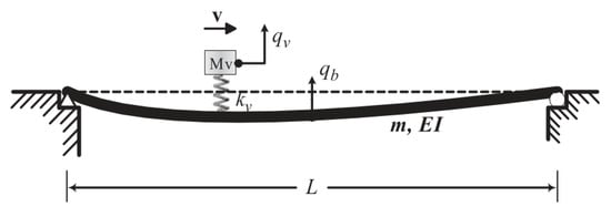 The feasibility of extracting the dynamic properties of a bridge based on vehicle responses was initially raised in the study conducted by Yang et al. [32]. For a simplified model (see Figure 2) with a sprung mass and a simply supported beam representing, respectively, the vehicle and the bridge, the authors derived a closed-form solution for the vertical displacement, velocity, and acceleration of the vehicle. In this solution, only the first mode of the bridge was considered, and the authors could demonstrate the presence of the bridge’s natural frequency in the vehicle’s response. The authors also addressed the influence of bridge damping and vehicle speed on the responses. It was shown that the increase in bridge damping is responsible for reducing the magnitude of the bridge’s contribution to the vehicle’s response. Regarding the vehicle’s speed, the authors noticed an increase in the response associated with higher vehicle speeds. This finding lead to the conclusion that higher speeds may help the identification of bridge frequencies; however, this preliminary study did not account for track irregularities which later studies have shown to cause difficulties for the identification when the vehicle is moving at high speeds.