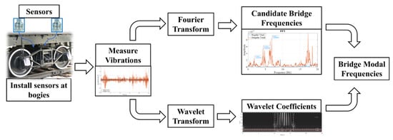 A different approach for dealing with the vehicle and driving frequency disturbance was adopted by Erduran et al. [23] which is schematically presented in Figure 4. Firstly, the vertical acceleration at the bogies from a few time steps before entering the bridge to a few moments after leaving it needs to be measured and its FFT computed. Then, some peaks of the Fourier amplitude spectrum are selected as candidate frequencies, and for each candidate frequency, the Continuous Wavelet Transform (CWT) coefficients are investigated over time. The frequencies which only presented significant energy levels during the bridge crossing are considered to be bridge natural frequencies. The validation of the technique was performed based on simulation data generated through detailed 3D models of the bridge, track, and vehicle. It was demonstrated that the first natural frequency of the bridge can be properly distinguished from contributions due to the vehicle and driving frequencies and track irregularities for speeds up to 90 km/h.