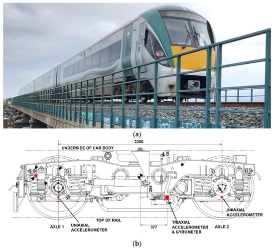 Drive-by natural frequency identification of the Malahide viaduct: (a) overview of the train and (b) experimental setup [26].