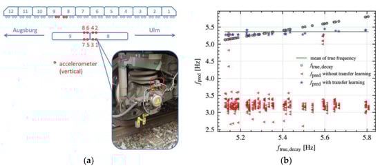 To develop an automatic methodology to bridge natural frequency identification, Lorenzen et al. [27] proposed a deep learning approach, more specifically a six fully connected layers neural network (NN), to identify the bridge’s natural frequency from the acceleration response of high-speed trains. A dataset of acceleration frequency spectra was developed based on 3131 simulated train passages and 52 passages measured with accelerometers installed on the wheelsets of an ICE 4 passenger train (see Figure 7a). This dataset contains passages at different speeds and, in the case of the simulated one, different bridges. Additionally, a set of accelerometers was installed at the bridge to derive reference values for the natural frequencies which were extracted by the Stochastic Subspace Identification (SSI) algorithm. Firstly, the NN was trained using only the simulated dataset and the weights of the layers stored; then, the concept of transfer learning was used and the previously trained NN had its last layer weights tuned during the training with experimental data. The results obtained with and without the transfer learning are presented in Figure 7b in the form of a scatter 2D plot in which the vertical axis represents the predicted natural frequency and the horizontal axis represents the “true natural frequency”. The variation presented in the “true” values is due to the nonlinear behavior of the bridge that presents lower frequency values associated with higher excitations provided by higher vehicle speeds. As can be seen in Figure 7b, the model trained with transfer learning can capture the true results very well; however, the same was not accomplished for the model trained with simulation data only. In turn, the authors argue that this is largely due to the extremely simple simulation model used which was unable to capture the torsion modes of the bridge, and better results are expected with the use of more sophisticated models.