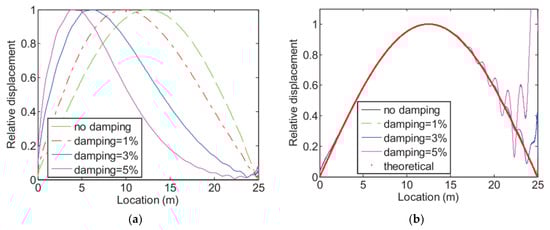 A recent study conducted by Tan et al. [29] further investigated the methodology proposed by Yang et al. [30] for different values of the bridge’s damping ratio. As presented in Figure 8a, the damping significantly distorts the mode shape, shifting it to the left. Based on an analytical formulation of the bridge vehicle interaction model considering the damping, the authors proposed a correction factor for the original formulation which is a function of the bridge’s natural frequency and damping ratio. As can be seen in Figure 8b, the proposed correction can significantly improve the results; however, some distortion is still present for high damping values, which the authors claim can be corrected by applying a smooth operation to the instantaneous amplitudes.