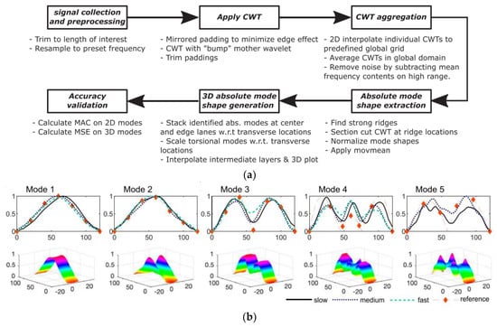 Mode shape extraction by the crowdsourced modal identification using continuous wavelet technique: (a) implementation flowchart and (b) results [51].