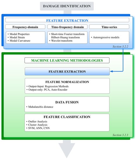 Meixedo et al. [57,78] and Santos et al. [79] showed that damage identification methodologies must resort to four main operations after data acquisition: (i) feature extraction, (ii) feature normalization, (iii) data fusion and (iv) feature classification.