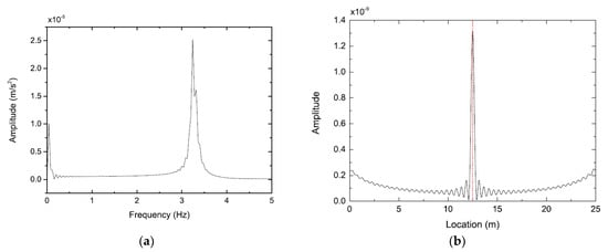 IAS results from numerical simulations of a test vehicle passing over a damaged beam: (a) FFT spectrum of the contact-point acceleration and (b) IAS amplitude [68].