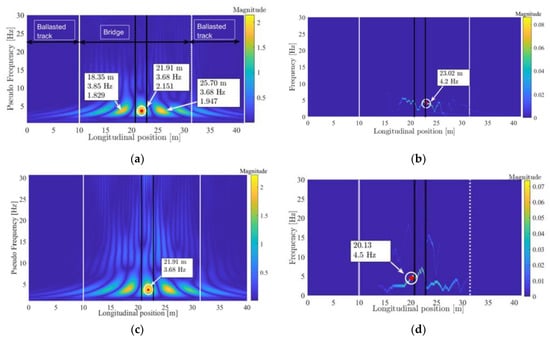 Damage detection results in either the absence (a,b) or in the presence (c,d) of track irregularities with the train traveling at 100 km/h. The module of the difference in wavelet coefficients (a) and Hilbert spectrum (b) for a considered total damage on the fastening between the diagonal member and the lateral chord. The module of the difference in wavelet coefficients (c) and Hilbert spectrum (d) for a considered total damage on the fastening between the side wall diagonal member and the lateral chord [22].