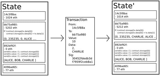 To understand Quorum, it is important to highlight some specifics about the Ethereum blockchain on which it runs. Ethereum can be characterised as a large distributed finite state machine, where transactions can be viewed as state transitions, i.e., a block is a list of transitions. Transactions (and hence state transitions) should be well-formed (have the right number of values) and carry a valid signature (there are other rules, see the Ethereum whitepaper [26]). A developer can define the specifics of transactions, and these programmable state transitions are known as smart contracts. In other words, a smart contract is a way to encode a state transition. As Ethereum stores the full ordered list of transactions (state transitions), it is possible to re-run the blockchain by replaying every state transition from the original state: this is what occurs when a node is synchronizing. An example of a state transition is shown in Figure 1, this illustrates how a smart contract, located at bb75a980, transitions the State to State’.