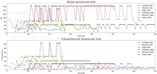 Quorum throughput over time in both KB per second (top) and tps (bottom). All three data storage methods (Calldata, Memory and State) are compared using both 2 KB and 10 KB transactions. Each marker represents a new block.