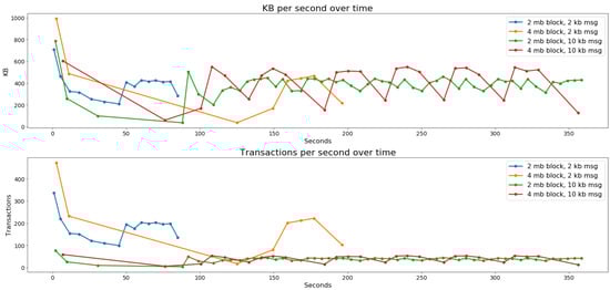 Figure 5 shows that the peak and initial throughput of Hyperledger Fabric is more or less indifferent to message size (2 KB and 10 KB) because Apache Kafka is the underlying messaging protocol. However, throughput reduces after the first 35–45 s, struggling under sustained load. Table 5 shows that peak throughput is significantly larger than average performance, and that Hyperledger Fabric handles large increases in message-size well. As noted by Thakker et al. [36] and Kuzlu et al. [40], Hyperledger Fabric can utilise channels to run multiple “contracts” in parallel and in so doing increase transaction throughput. We increased the number of channels but our experimental results did not reflect this finding. This may be because of limited computing power. To test this assumption, tests were re-run with a larger machine as the orderer and we observed that performance increases 3% for the single channel case, and 18% for the four channel case, indicating that channels have some overhead, but result in increased throughput when used with more computing power. As noted by Thakker et al. [36], the endorsement policy is identified as a performance bottleneck, however, our tests show no significant difference between the policies “majority” and “any”. Comparing our results to the literature [36,38,39,40,42], and Hyperledger’s own Caliper tests [45], similar performance is observed. Gorenflo et al. [37] present a study of the bottlenecks in Hyperledger Fabric, which can be summarized as message communication overhead internal to its architecture.