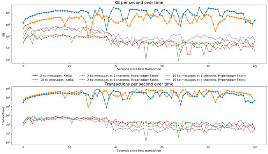Hyperledger Fabric and Kafka throughput over time, in both KB per second (top) and tps (bottom). Comparing 2 KB and 10 KB transactions.