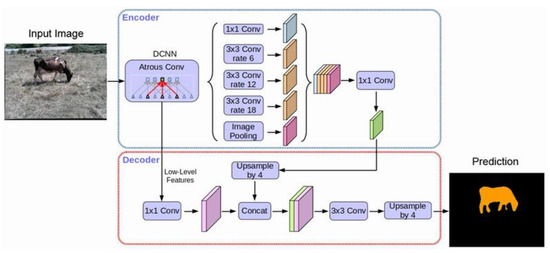 Deep learning, a sub-branch of machine learning, is used in many different fields. Deep learning algorithms offer better results than traditional machine learning algorithms if more data are provided. Therefore, object segmentation approaches such as Mask R-CNN [29] based on deep learning can also be used to perform tasks such as weight estimation. Semantic segmentation is used to determine object boundaries. In this study, deep learning semantic segmentation methods were used on stereo images, and then the areas covered by the animals in the images were determined. Semantic segmentation classifies each pixel in the image as belonging to a class. Various models have been introduced in semantic segmentation over time: the Fully Convolutional Network [30], which is based on deep learning; U-Net [31], which takes its name from its architecture and is used especially in medical problems; and Deeplab v3+ [32], which showed the highest success in segmentation tasks in the PASCAL VOC 2012 dataset in 2018. In this study, the PASCAL VOC 2012 dataset and Deeplab v3+ segmentation model were used to perform segmentation tasks on the rectified images. Deeplab v3+ architecture is shown in Figure 6.