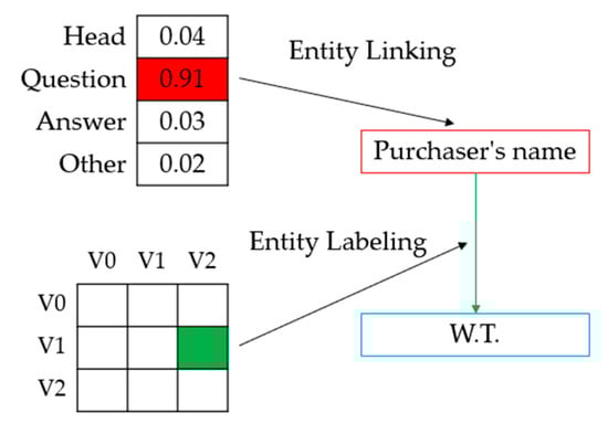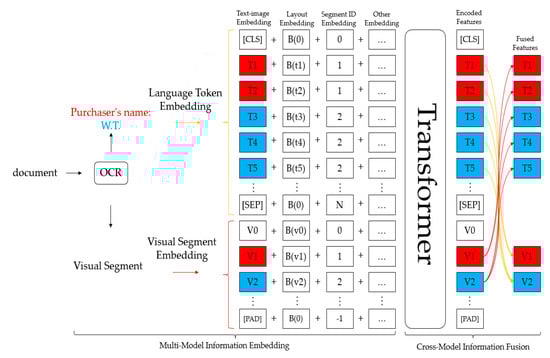Figure 2 shows a schematic diagram of the overall model framework of the model StrucTexT [5] used in this paper. In a given input image with pre-processed OCR results such as bounding boxes and text segment content, for example, various pieces of information in terms of text, image, and layout are utilized through the feature-embedding phase. The multimodal embedding is then fed back to the pre-trained transformer to obtain rich semantic features. The transformer accomplishes cross-modal fusion by creating interactions between different modal inputs. Figure 3 shows a diagram of the model’s pre-training task. Finally, the structured text understanding module receives the encoded features, performs entity recognition for entity labeling, and then performs relationship extraction of entity connections, as shown in Figure 4.