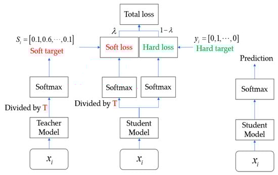 For the same input vector , the predicted output of the teacher model is calculated, divided by the temperature coefficient T, and then transformed via softmax to obtain the soft target, i.e., the softened probability distribution. Afterwards, the predicted output of the student model is calculated, divided by the temperature coefficient T, and transformed via softmax, and cross-entropy loss is calculated using the soft target. The overall loss calculation is as follows: