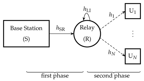 In the second phase, the relay forwards the signal with the AF protocol to N users . By the AF relaying, the relay amplifies the received signal by a factor with a processing delay . The transmit signal of the relay can be expressed as