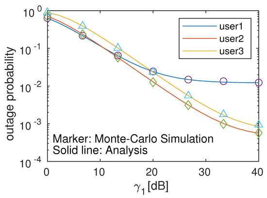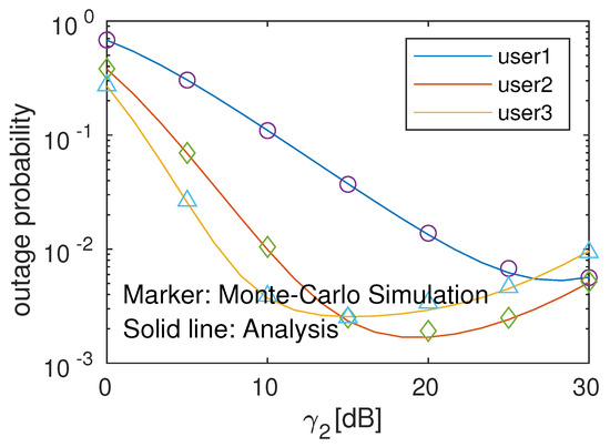 We define the outage event , where is the target threshold for the jth user. Then, event means that the ith user cannot decode the jth user’s signal. An outage occurs for the ith user when any of occurs. The probability of an outage for the ith user can be expressed as