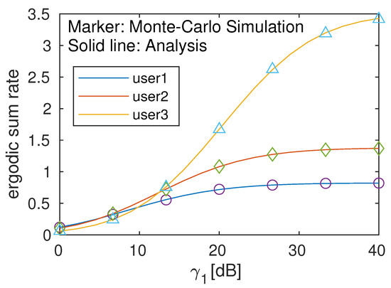 Ergodic rates versus SNR in the first phase () with , , , , , quantization bits , and power allocation coefficients .