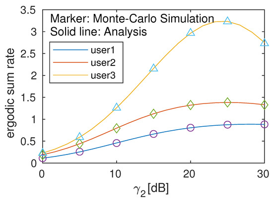 Ergodic rates versus SNR in the second phase () with , , , , , quantization bits , and power allocation coefficients .