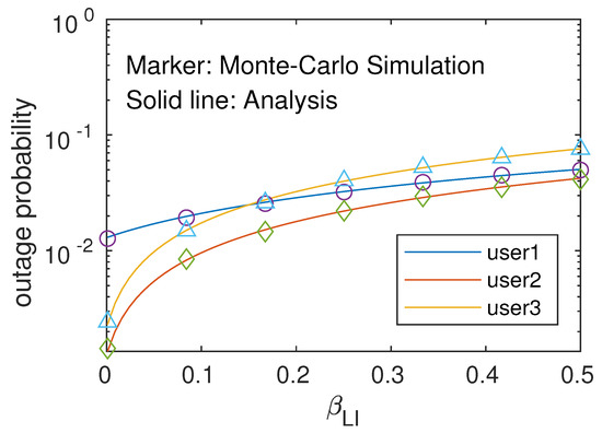 Outage probability versus different loopback interference levels () with , , , , , quantization bits , power allocation coefficients , and .