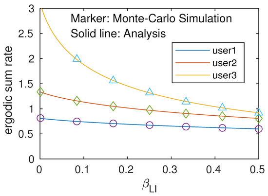 Ergodic rates versus different loopback interference levels () with , , , , , quantization bits , and power allocation coefficients .