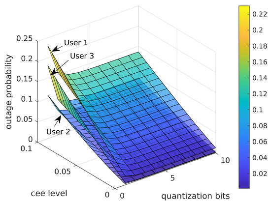 Outage probability versus channel estimation error level and quantization bits with , , , , , power allocation coefficients , and .