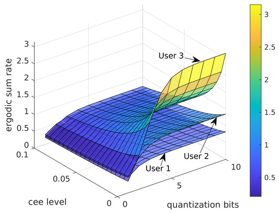 Ergodic rates versus different channel estimation error levels and quantization bits with , , , , , and power allocation coefficients .