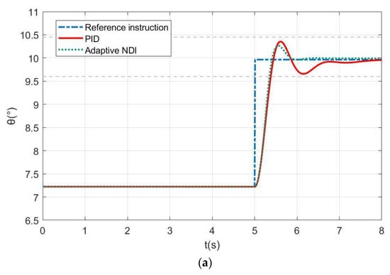 After the recursive identification achieves convergence, The control switch will trigger the controller switching to NDI control mode, then use the PID controller and NDI controller to track the pitch angle step command, respectively. Since the accuracy of identification has been explored and explained in detail in the previous section, this section only shows the image of the instruction tracking part.