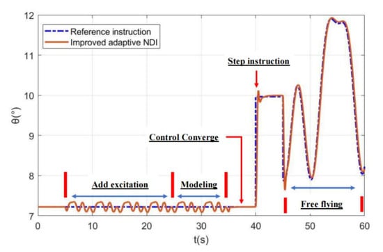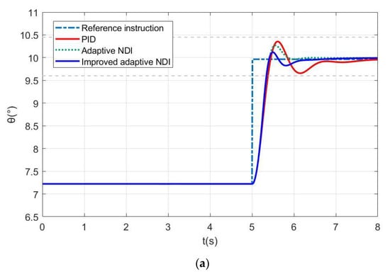 Under the same conditions as Section 5.2, the simulation verification of the improved NDI control method is carried out. Similarly, in the simulation of this section, all links including recursive detrending, identification, and step pitch angle command are also used, and only the image of the step command tracking stage is displayed.