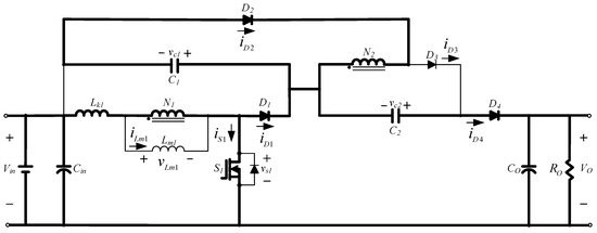The circuit conduction situation in this mode is indicated in Figure 2. remains on, and the input voltage is directly applied to the primary side of the coupled inductor. Accordingly, the current through the secondary side charges the capacitor , and the diode remains forward-biased until is turned off at the end of this mode. The voltage drops across components and the currents therethrough are governed by