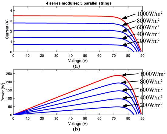 A family of (a) I-V and (b) P-V curves for a 4S-3P configuration with shading as a parameter.