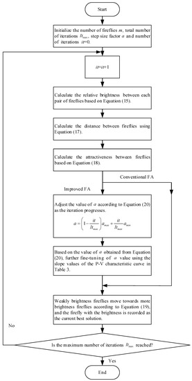 where and represent the upper and the lower bound of , respectively, and it represents the number of iterations. Subsequently, is slightly tuned according to the slope s of a P-V curve, as illustrated in Figure 8. Table 3 lists the correlation between s and the slightly tuned , and it must be stressed that is tuned on the condition that ∆P > 0. In this fashion, the GMPP can finally be tracked down. A flowchart combining the conventional FA and the improved FA in Figure 9 is used to illustrate the working steps of the conventional FA and the improved FA in this study.