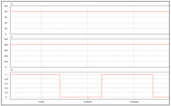 Figure 10 gives waveforms of the simulated input voltage , output voltage and the duty cycle D signal at a full load of 300 W. An input voltage of 80 V was raised to an output voltage of 400 V when D was 0.567.