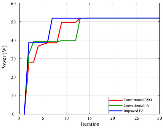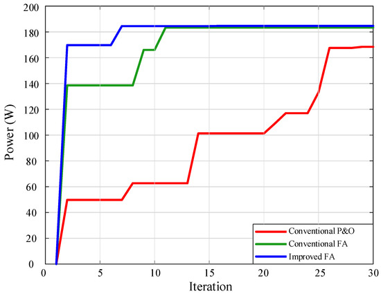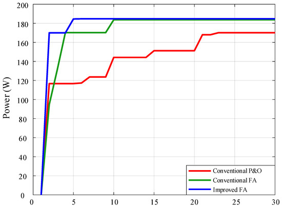 In this scenario, the PV array was unshaded and provided a maximum output power of 239.1 W, as illustrated in Figure 11. The tracking performance is compared in Figure 12. It can be easily seen that this work outperformed the original FA and the traditional P&O method.