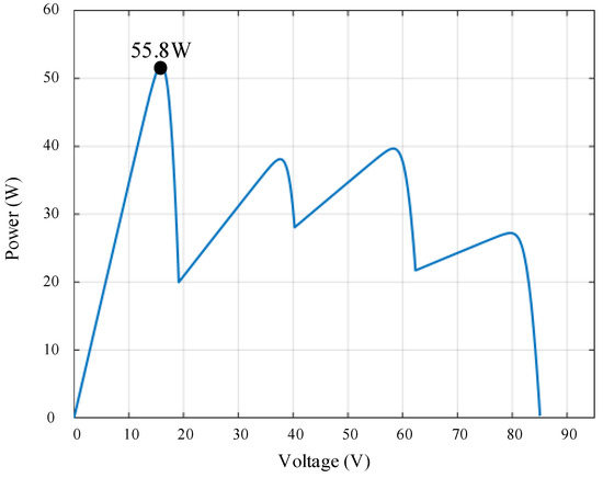 As listed in Table 6, nine modules were shaded in this scenario, that is, 70% of the first third, 80% of the second third and 90% of the last third modules were shaded. As illustrated in Figure 19, there were 4 peaks on the P-V curve, and the global maximum output power was as low as 55.8 W. Unlike in Scenarios 1–4, the GMPP instead lay near the left endpoint of the P-V curve this time. In Figure 20, it is observed that the P&O method got trapped in a LMPP more easily than others, even though all the three algorithms finally succeeded in tracking down the GMPP. Above all, this work outperformed others again.