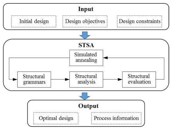 The STSA algorithm is used for structural generation and optimization in this study. It integrates shape grammar and structural evaluation into an improved simulated annealing algorithm, forming a discrete structural optimization method. The shape grammar defines the basic rules for structural size, shape, and topology transformations. Each rule acts dynamically on the initial structure based on probabilities, achieving free transformation of the structural configuration. The workflow is shown in Figure 1 [28].