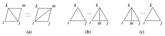 Topology modification types: (a) DOFs remain unchanged; (b) DOFs increase; (c) DOFs decrease.