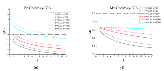 Indicator curves of three combinations: (a) Fr–Cholesky/PCG; (b) Mr–Cholesky/PCG; (c) Fr–Cholesky/Epsilon; (d) Mr–Cholesky/Epsilon; (e) Fr–Cholesky/ICA; (f) Mr–Cholesky/ICA.