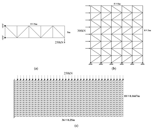 To validate the effectiveness of the proposed selection criterion, two types of numerical case studies were conducted in this section. One type is an example of a truss design based on the STSA-P system [32]. As the DOFs for this type of structural design are generally low, another example type of truss structural optimization with higher DOFs was designed. These examples were implemented using the MATLAB programming language and executed on a computer with Intel(R) Core(TM) i7-6700k CPU @ 4.00GHz.