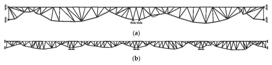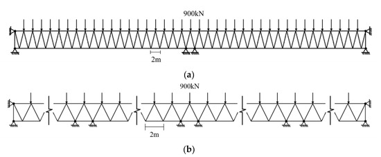 This section included two cases. The first case is a two-span truss structure, and the second is a four-span truss structure. The initial structures for both cases are shown in Figure 10, with a total length of 80 m and 160 m and a height of 4 m. The two-span structure contained 83 nodes with 154 DOFs, and the four-span structure contained 163 nodes with 306 DOFs. Both structures were subject to a 900 kN point load on the upper chord. The material information for both structures was the same as that of the example shown in Section 5.1.